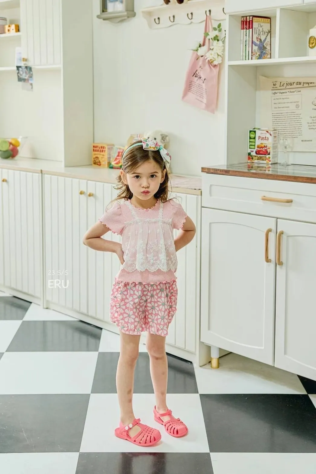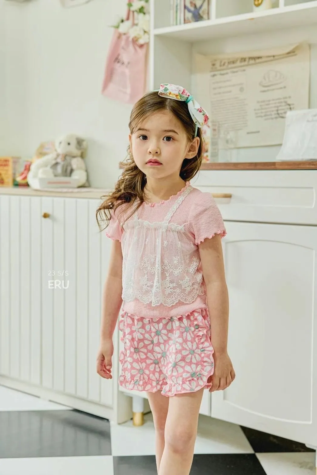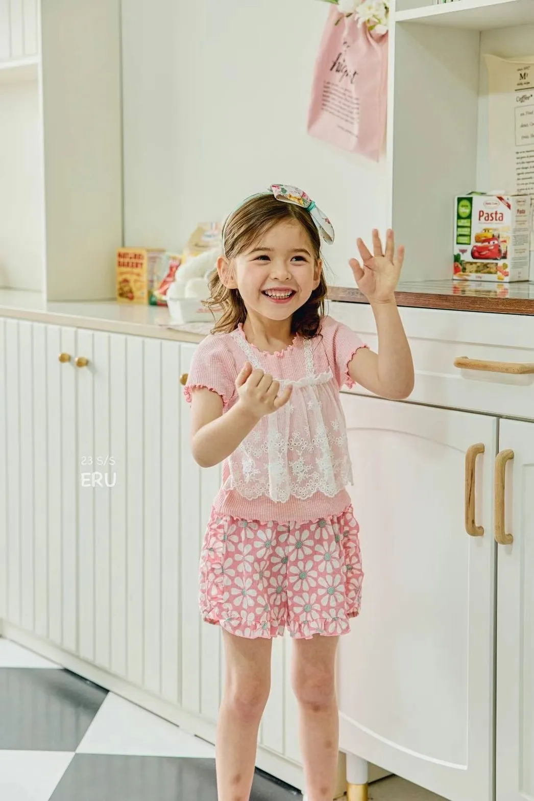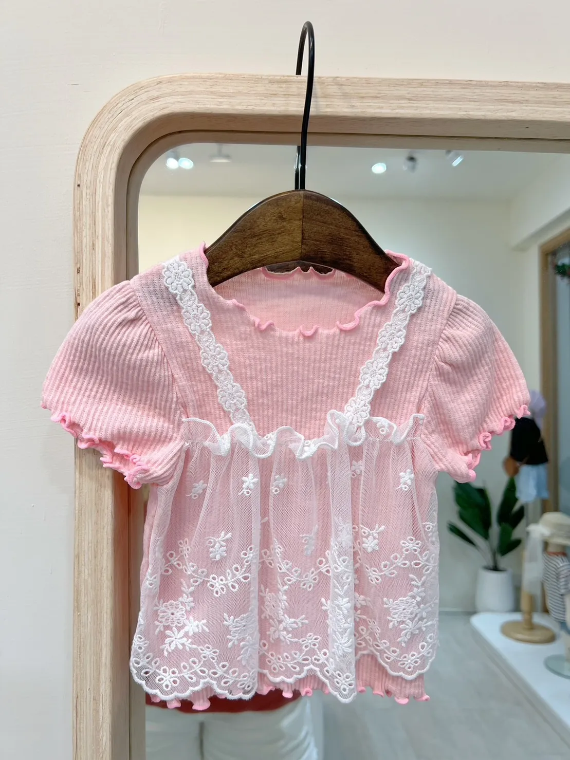 正韓假兩件坑條蕾絲短T(80-120cm現貨)