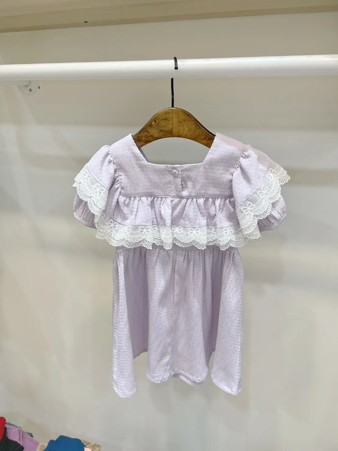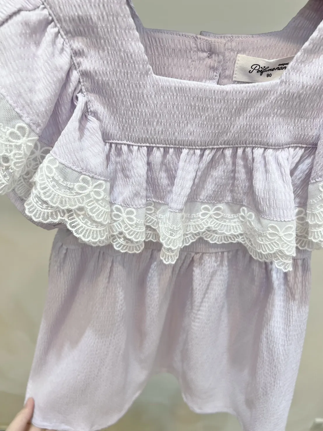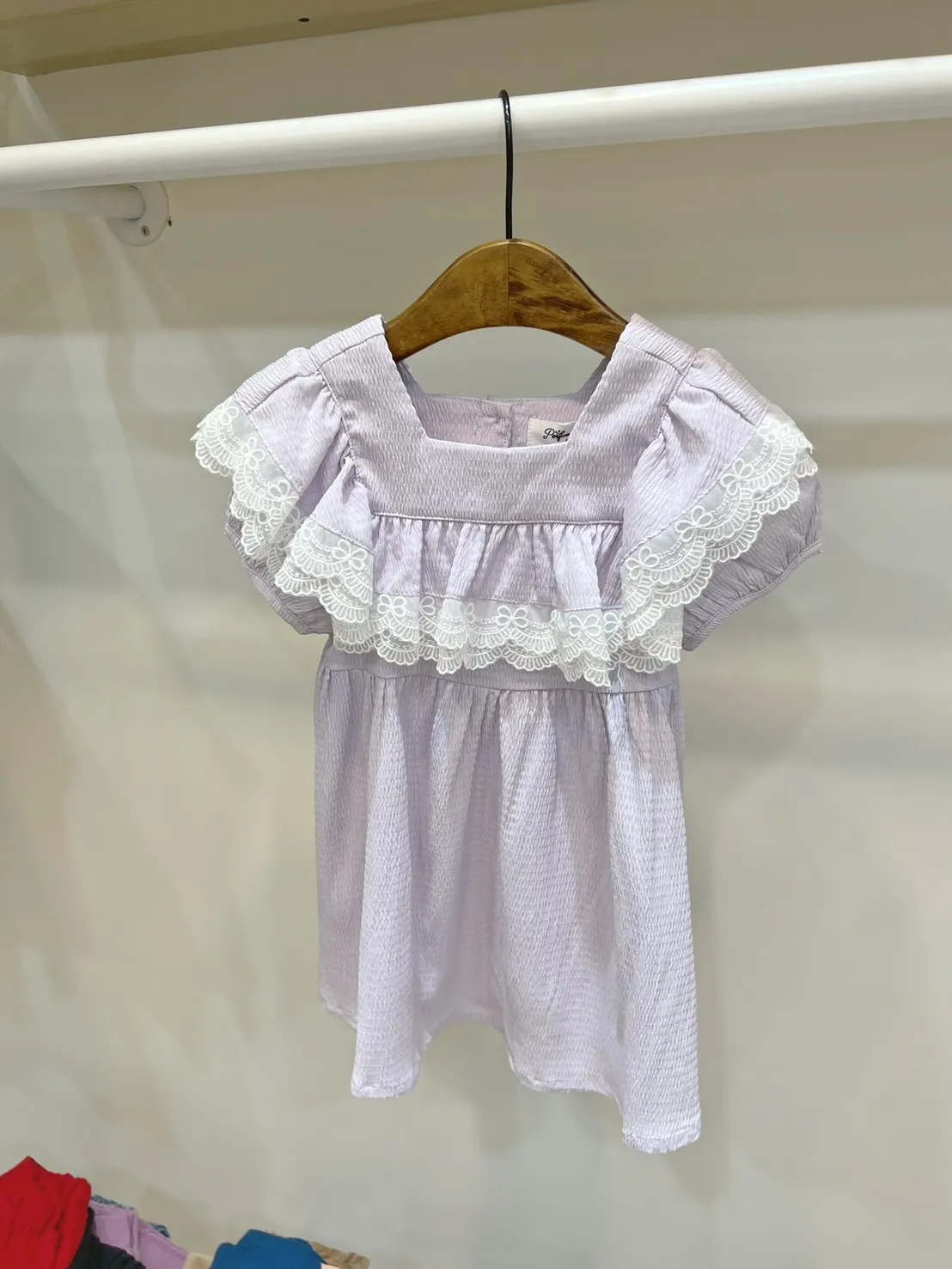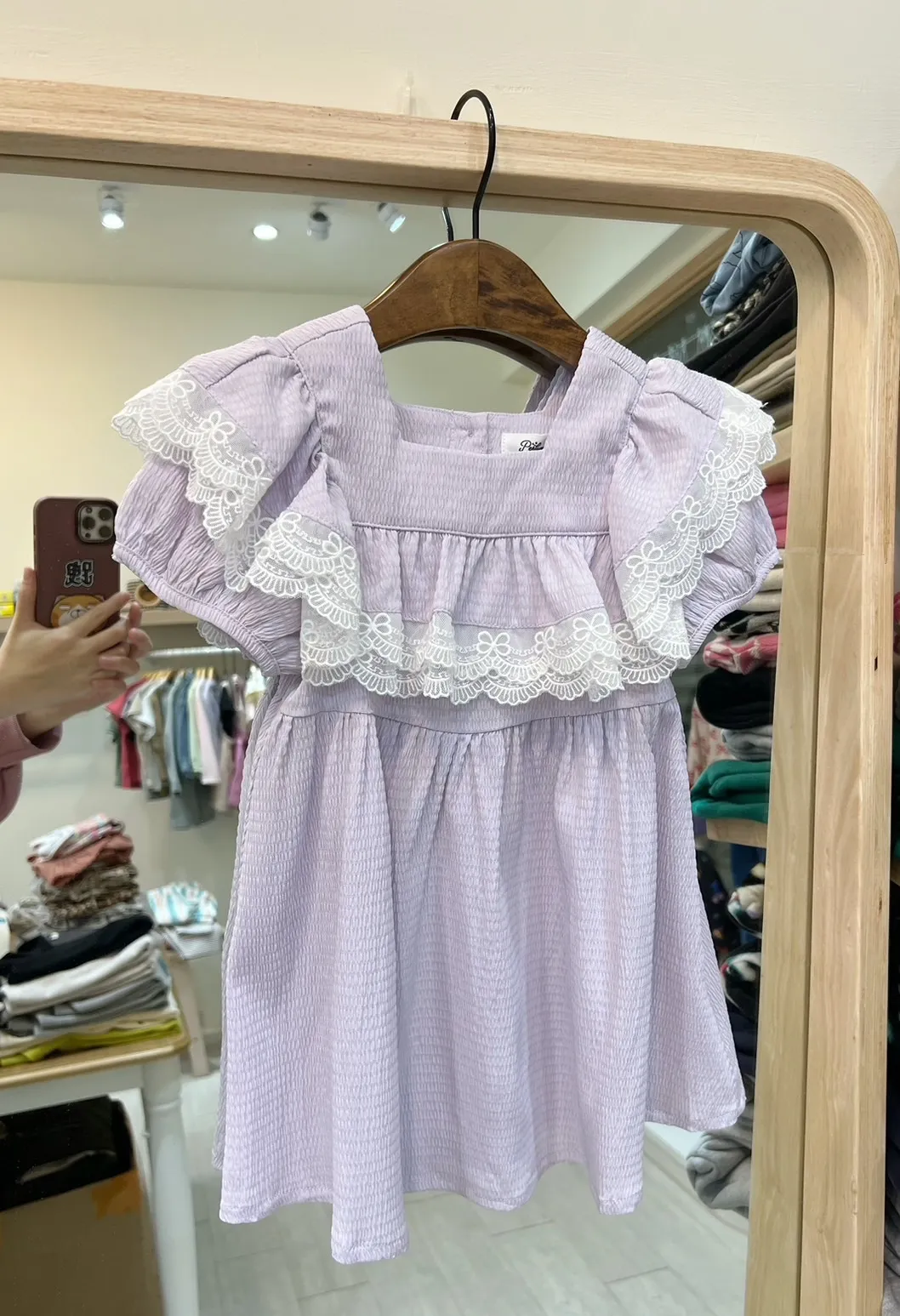 香水娜娜~皺皺布⾞花邊⽅領洋裝(90-140cm現貨)
