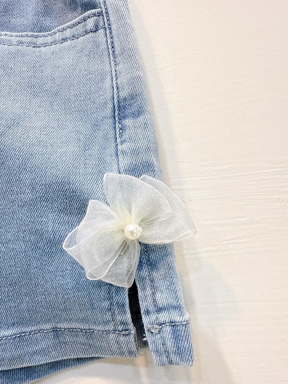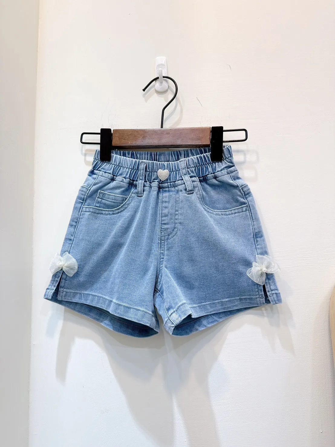香水娜娜~腳叉蝴蝶結⽜仔短褲(90-160cm現貨)
