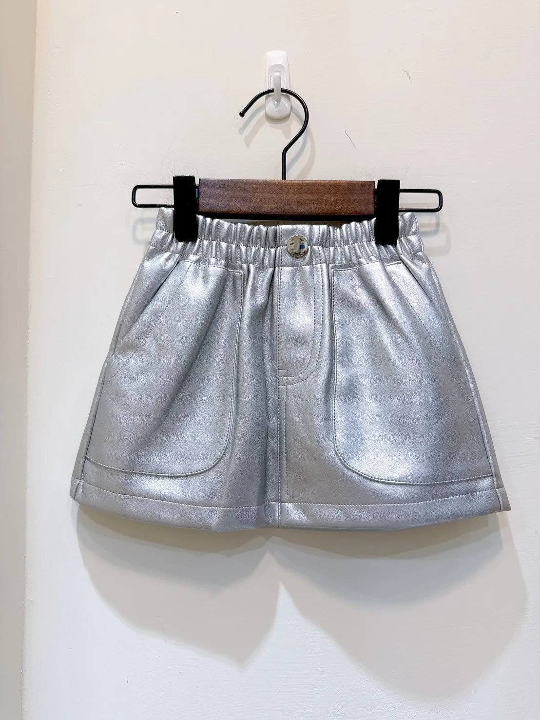 香水娜娜~貼袋銀⾊⽪裙(90-140cm現貨)