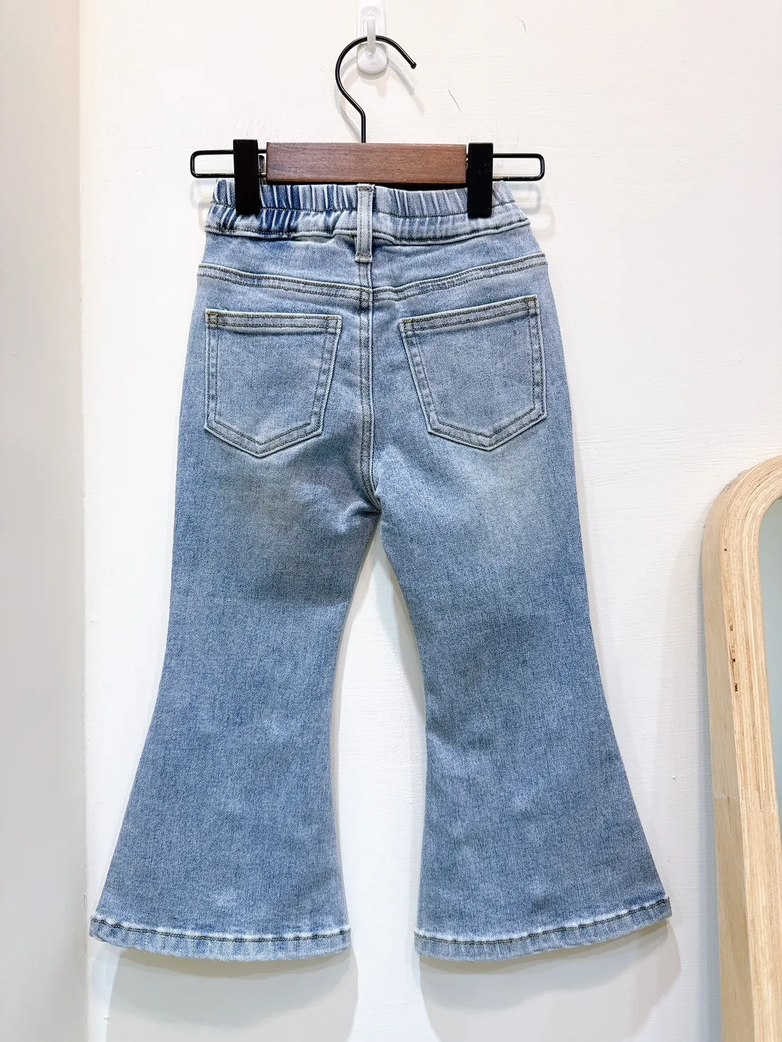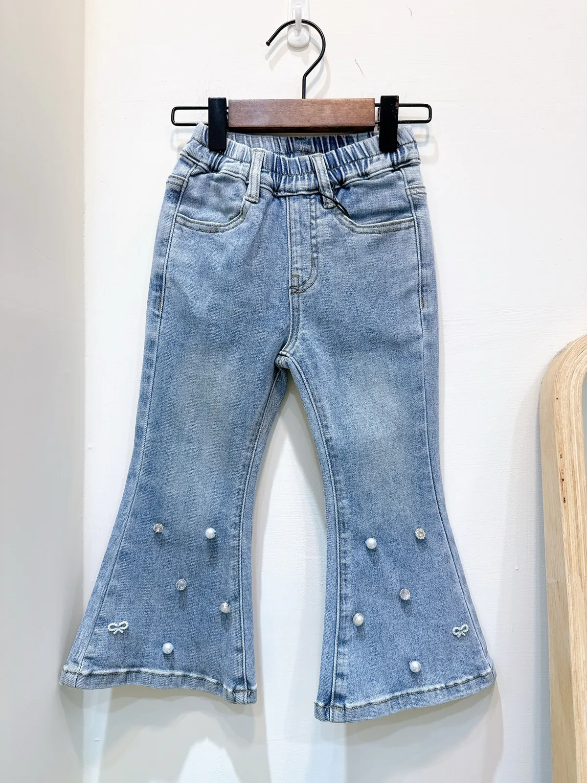 香水娜娜~褲腳打珠喇叭⽜仔褲(90-140cm現貨)