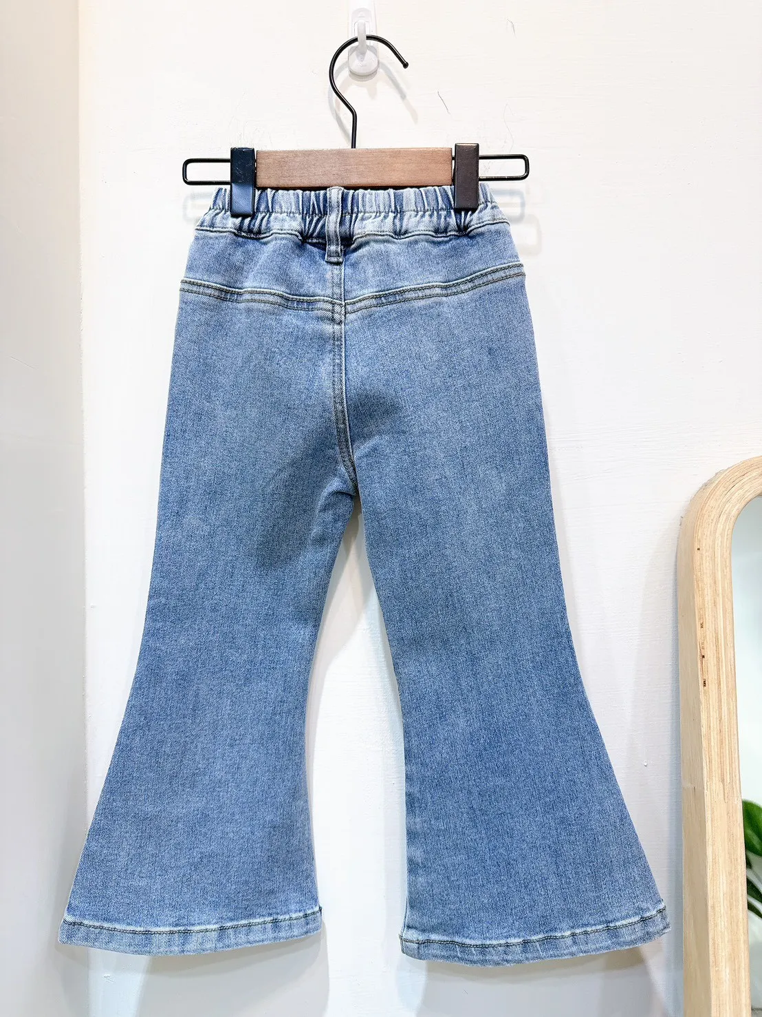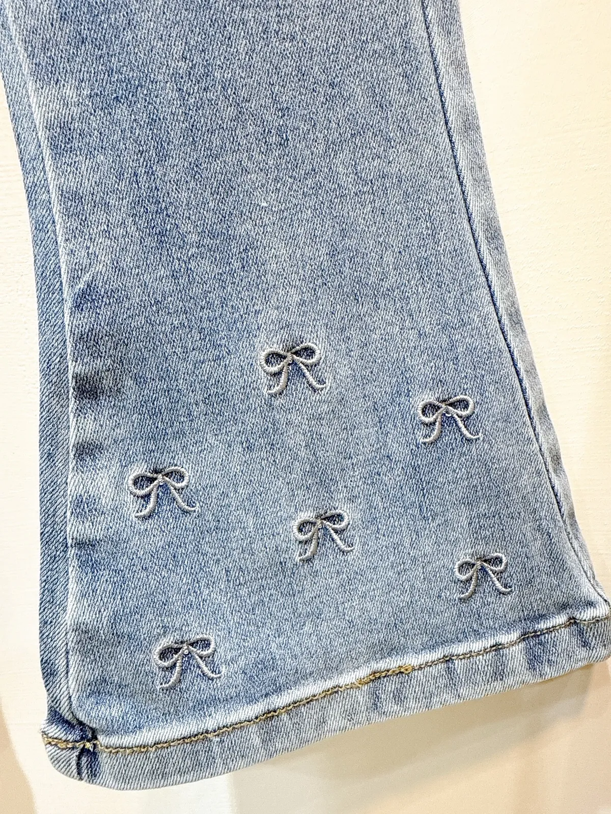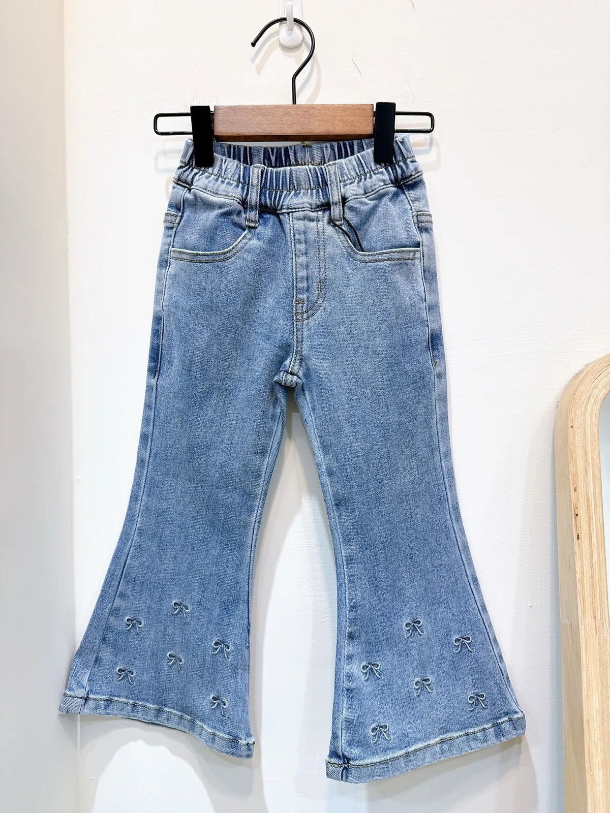 香水娜娜~繡蝴蝶結喇叭⽜仔褲(90-140cm現貨)