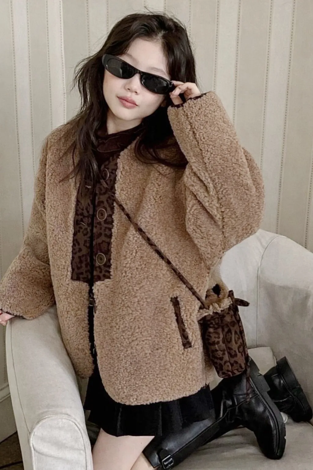 女童羊羔毛豹紋排釦外套(130-170cm現貨)