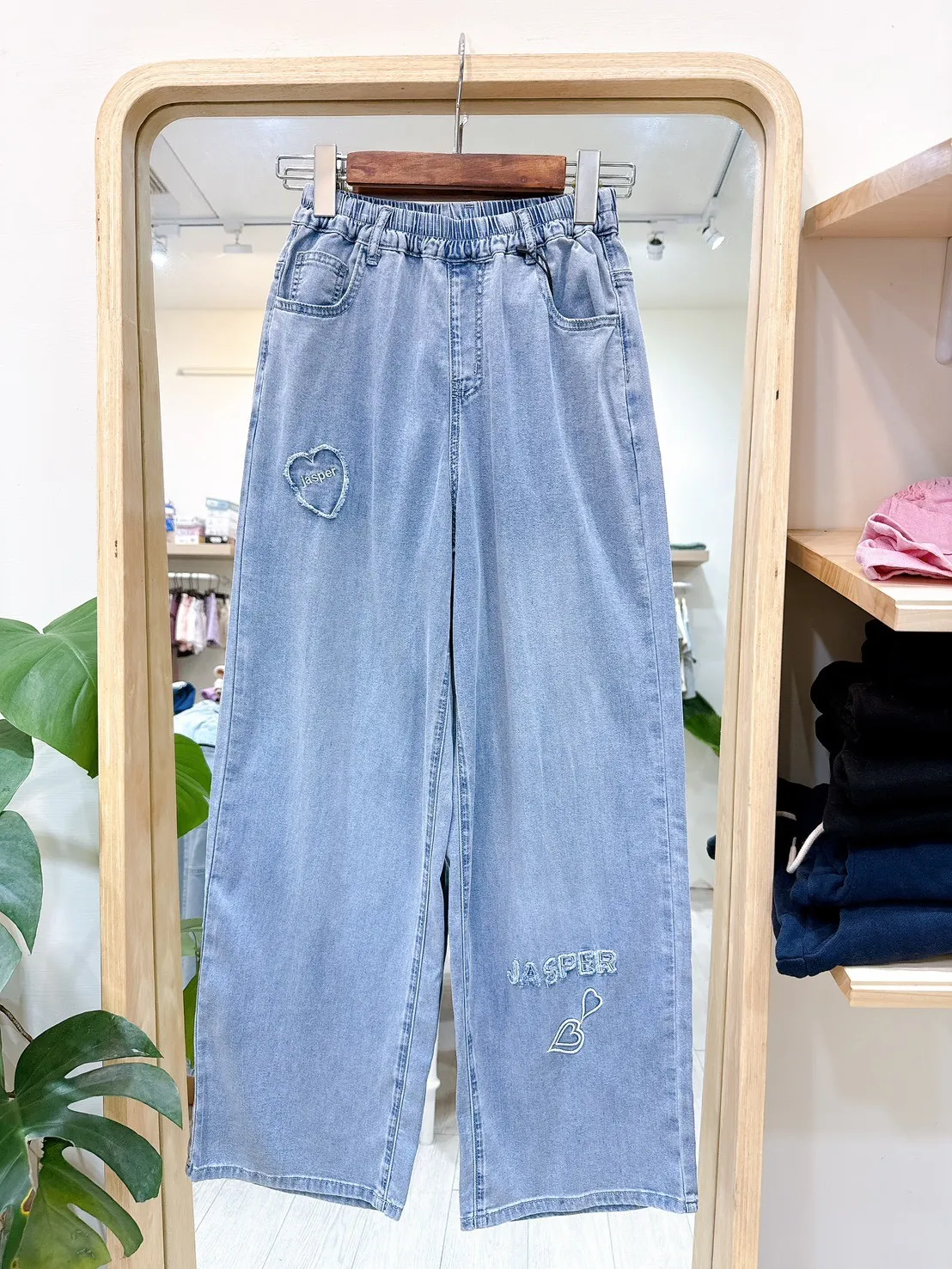 香水娜娜~貼布愛⼼天絲⽜仔長褲(150-160cm現貨)