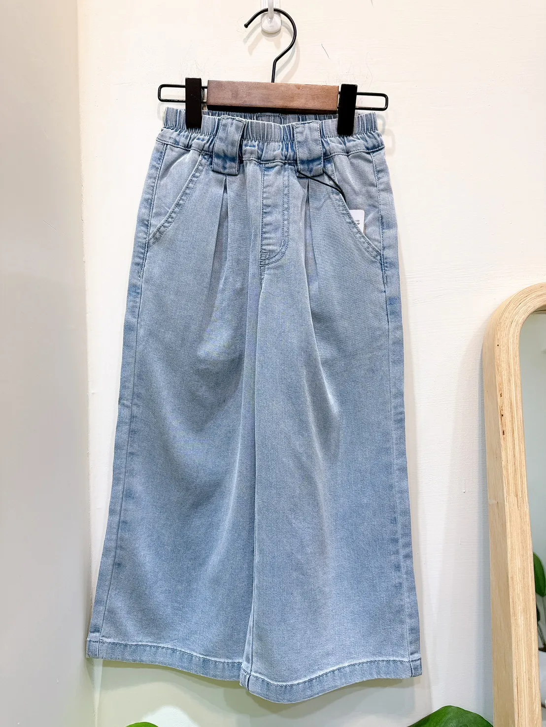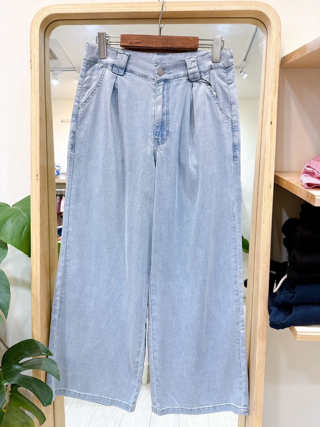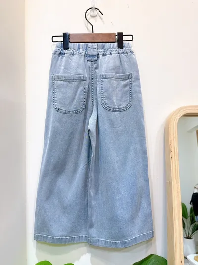 香水娜娜~寛耳素⾊天絲⽜仔寬腿褲(110-160cm,媽媽現貨)