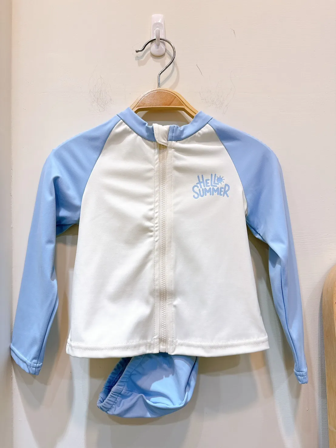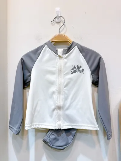香水娜娜~印花撞⾊袖開襟泳衣(90-140cm現貨)
