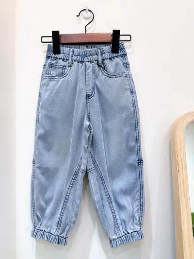 香水娜娜~撞⾊線束腳天絲⽜仔長褲(90-140cm現貨)