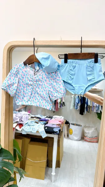 香水娜娜~泡泡袖碎花泳衣套裝(90-140cm現貨)